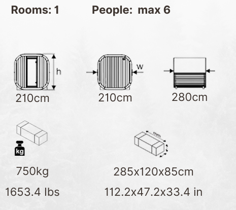 It also includes two interior opposite-facing thermowood benches for sitting or reclining; flat floor; heater guard; cradle supports; stainless steel bands with bolts for tightening and black colour bitumen shingle roofing with roof drip edge.