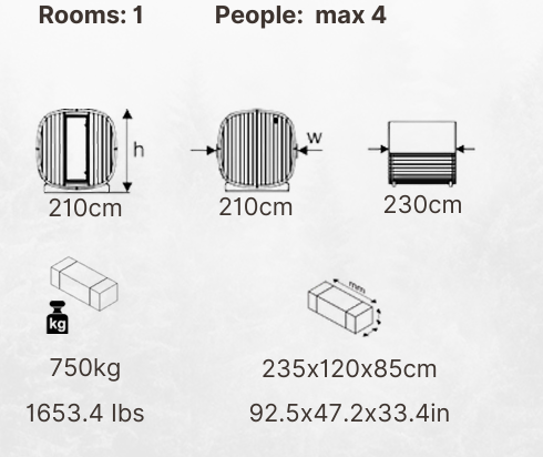 Optional Upgrades: full glass front window, semi-panoramic back wall window, wooden front door with two side windows (66,5 x 30 cm), bench made of thermo aspen or alder, backrests, front arches to cover the front end and LED lights.